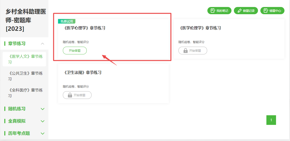 特別提示:【章節(jié)練習】-【《醫(yī)學人文》章節(jié)練習】-【《醫(yī)學心理學》章節(jié)練習】已開通免費試用供大家體驗。(購買《密題庫》即可解鎖精彩的隨機練習及歷年考點題模塊。)