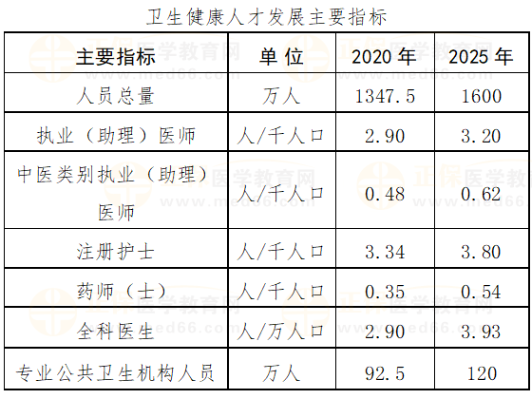 2024年是健康中國十四五規(guī)劃的第四年,也就是十四五規(guī)劃完成既定目標(biāo)的倒數(shù)第二年?!?a href="http://www.tymfj.cn/yishizigekaoshi/jiaodian/ta2310098206.shtml" target="_blank">“十四五”衛(wèi)生健康人才發(fā)展規(guī)劃》中明確,到2025年,衛(wèi)生健康人員總量達(dá)到1600萬人,每千人口執(zhí)業(yè)(助理)醫(yī)師數(shù)達(dá)到3.20人(其中中醫(yī)類別0.62人)、每千人口注冊護(hù)士數(shù)達(dá)到3.80人、每千人口藥師(士)數(shù)達(dá)到0.54人,每萬人口全科醫(yī)生數(shù)達(dá)到3.93人,專業(yè)公共衛(wèi)生機(jī)構(gòu)人員數(shù)增長到120萬人。