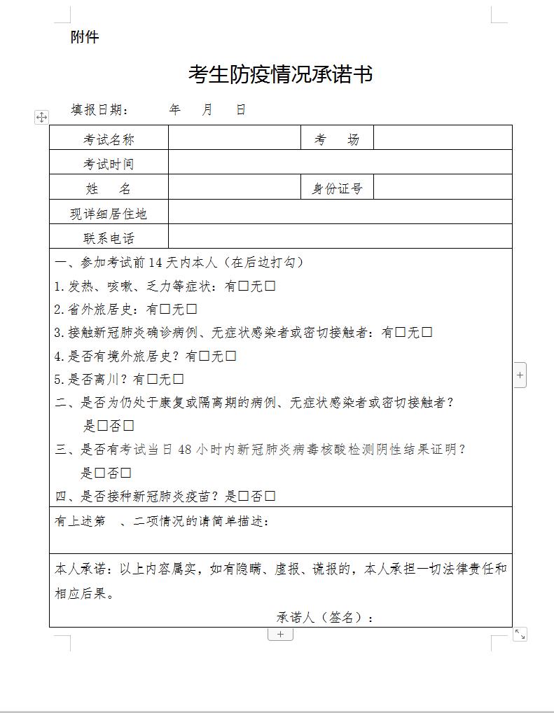一、參加考試前14天內(nèi)本人(在后邊打勾) 1.發(fā)熱、咳嗽、乏力等癥狀:有□無□ 2.省外旅居史:有□無□ 3.接觸新冠肺炎確診病例、無癥狀感染者或密切接觸者:有□無□ 4.是否有境外旅居史?有□無□ 5.是否離川?有□無□ 二、是否為仍處于康復(fù)或隔離期的病例、無癥狀感染者或密切接觸者? 是□否□ 三、是否有考試當(dāng)日48小時內(nèi)新冠肺炎病毒核酸檢測陰性結(jié)果證明? 是□否□ 四、是否接種新冠肺炎疫苗?是□否□ | |||