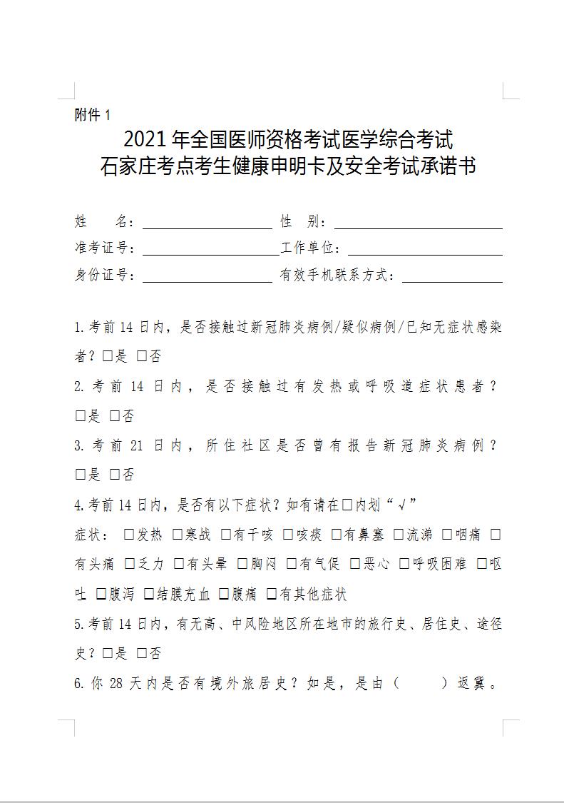 附件: 《2021年全國醫(yī)師資格考試醫(yī)學(xué)綜合考試石家莊考點考生健康申明卡及安全考試承諾書》
