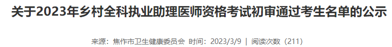 焦作考點2023年鄉(xiāng)村全科執(zhí)業(yè)助理醫(yī)師資格考試初審?fù)ㄟ^考生名單