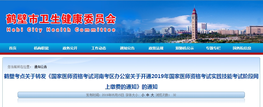鶴壁考點(diǎn)關(guān)于轉(zhuǎn)發(fā)《國(guó)家醫(yī)師資格考試河南考區(qū)辦公室關(guān)于開(kāi)通2019年國(guó)家醫(yī)師資格考試實(shí)踐技能考試階段網(wǎng)上繳費(fèi)的通知》的通知,具體通知內(nèi)容整理如下: