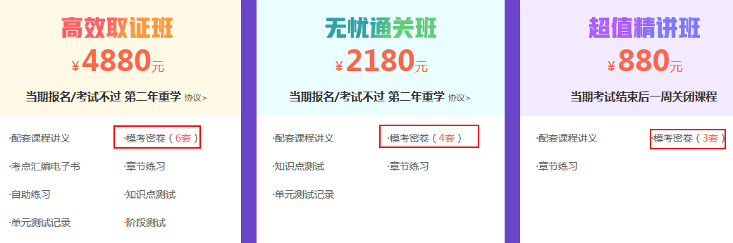 你想要幾套模擬試卷就看你購買的是什么班次了,網(wǎng)校的模擬試卷是不單賣的喲,只跟隨不同的班次贈送不同的數(shù)量。還在等什么,2019年的考生都已經(jīng)購課開始復(fù)習(xí)了,因為2019年的大綱變化讓大家“心慌慌”,所以趁早復(fù)習(xí)才是硬道理,點擊去購課>>