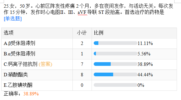 女,50歲。心前區(qū)陣發(fā)性疼痛2個(gè)月,多在夜間發(fā)作,與活動(dòng)無(wú)關(guān)。每次發(fā)作15分鐘,發(fā)作時(shí)心電圖Ⅱ、Ⅲ、aVF導(dǎo)聯(lián)ST段抬高。首選治療的藥物是