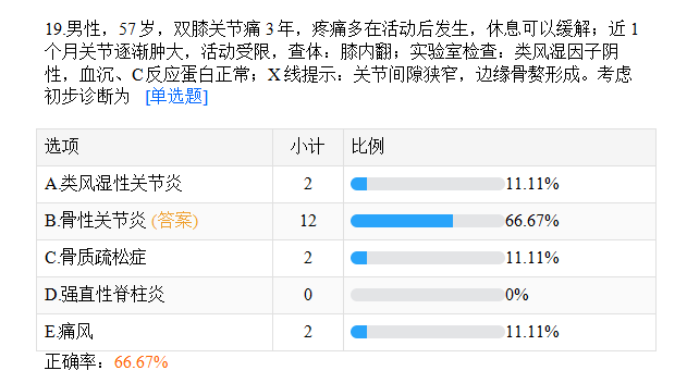 男性,57歲,雙膝關(guān)節(jié)痛3年,疼痛多在活動后發(fā)生,休息可以緩解;近1個月關(guān)節(jié)逐漸腫大,活動受限,查體:膝內(nèi)翻;實(shí)驗(yàn)室檢查:類風(fēng)濕因子陰性,血沉、C反應(yīng)蛋白正常;X線提示:關(guān)節(jié)間隙狹窄,邊緣骨贅形成??紤]初步診斷為