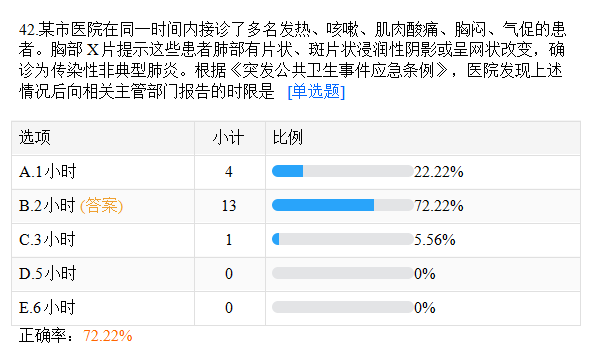 【答案解析】 《突發(fā)公共衛(wèi)生事件應急條例》規(guī)定,突發(fā)事件監(jiān)測機構、醫(yī)療衛(wèi)生機構和有關單位發(fā)現(xiàn)有下列情形之一的,應當在2小時內(nèi)向所在地縣級人民政府衛(wèi)生行政主管部門報告: