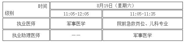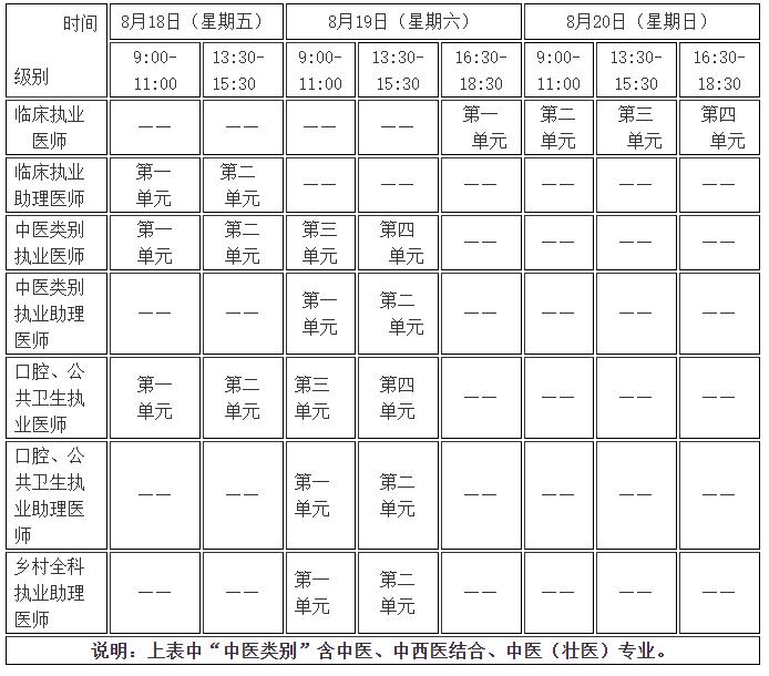 考試實行計算機化考試,軍隊現(xiàn)役人員加試軍事醫(yī)學(xué)、院前急救崗位和兒科專業(yè)加試相應(yīng)內(nèi)容。中醫(yī)類別蒙醫(yī)、藏醫(yī)、維醫(yī)、哈薩克醫(yī)專業(yè)實行紙筆考試。統(tǒng)一考試時間如下: