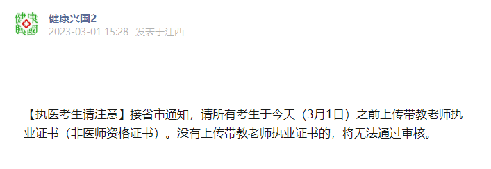 【執(zhí)醫(yī)考生請(qǐng)注意】接省市通知,請(qǐng)所有考生于今天(3月1日)之前上傳帶教老師執(zhí)業(yè)證書(shū)(非醫(yī)師資格證書(shū))。沒(méi)有上傳帶教老師執(zhí)業(yè)證書(shū)的,將無(wú)法通過(guò)審核。