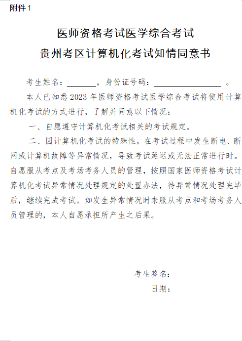 附件:1.《醫(yī)師資格考試醫(yī)學綜合考試貴州考區(qū)計算機化考試知情同意書》
