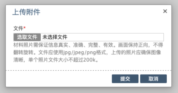 材料照片需保證信息真實(shí)、準(zhǔn)確、完整、有效。畫面保持正向,不得翻轉(zhuǎn)旋轉(zhuǎn)。文件應(yīng)使用jpg/jpeg/png格式,上傳的照片應(yīng)確保圖像清晰,單個(gè)照片文件大小不超過200k。