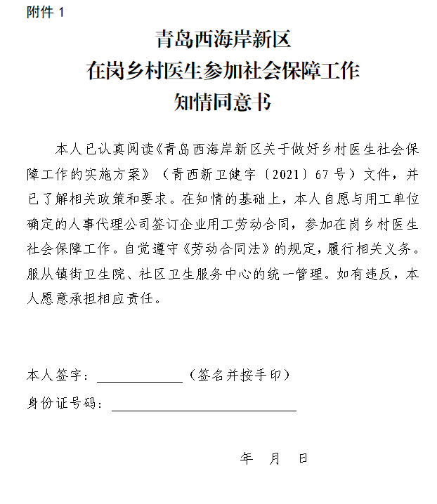青島西海岸新區(qū)在崗鄉(xiāng)村醫(yī)生參加社會(huì)保障工作知情同意書