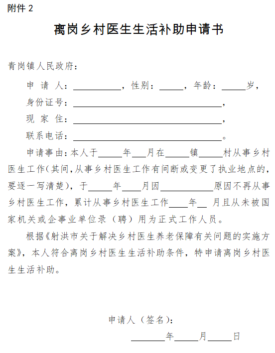 根據(jù)《射洪市關(guān)于解決鄉(xiāng)村醫(yī)生養(yǎng)老保障有關(guān)問題的實(shí)施方案》,本人符合離崗鄉(xiāng)村醫(yī)生生活補(bǔ)助條件,特申請離崗鄉(xiāng)村醫(yī)生生活補(bǔ)助。
