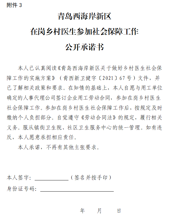 青島西海岸新區(qū)《在崗鄉(xiāng)村醫(yī)生參加社會保障工作公開承諾書》模板(附下載)