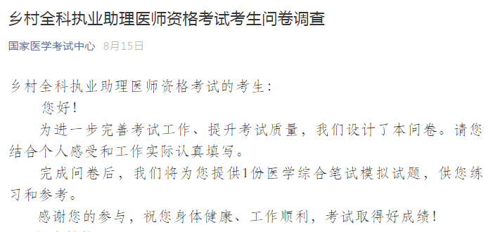大家可能不知道,2019年鄉(xiāng)村全科助理醫(yī)師筆試考前國(guó)家醫(yī)考中心微信公眾號(hào)發(fā)布了一條關(guān)于鄉(xiāng)村全科助理醫(yī)師報(bào)考及考試內(nèi)容的調(diào)查問卷: