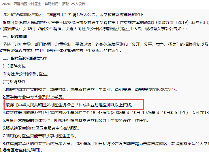 考鄉(xiāng)村全科執(zhí)業(yè)助理醫(yī)師必要性,沒證幾乎無路可走了!醫(yī)學(xué)教育網(wǎng)查看了最近各地區(qū)招聘鄉(xiāng)村醫(yī)生的要求,整理如下: