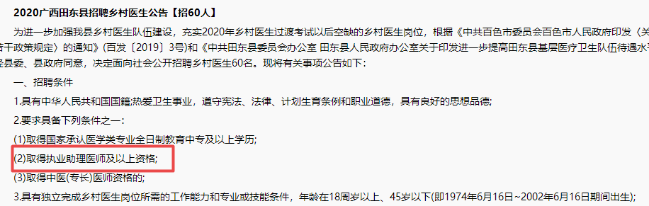 2020廣西田東縣招聘鄉(xiāng)村醫(yī)生公告【招60人】