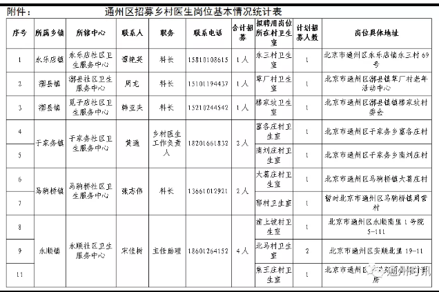 招募范圍:永樂店、于家務、漷縣、馬駒橋、永順、覓子店等6個地區(qū)10個村衛(wèi)生室11名鄉(xiāng)村醫(yī)生崗位人員。