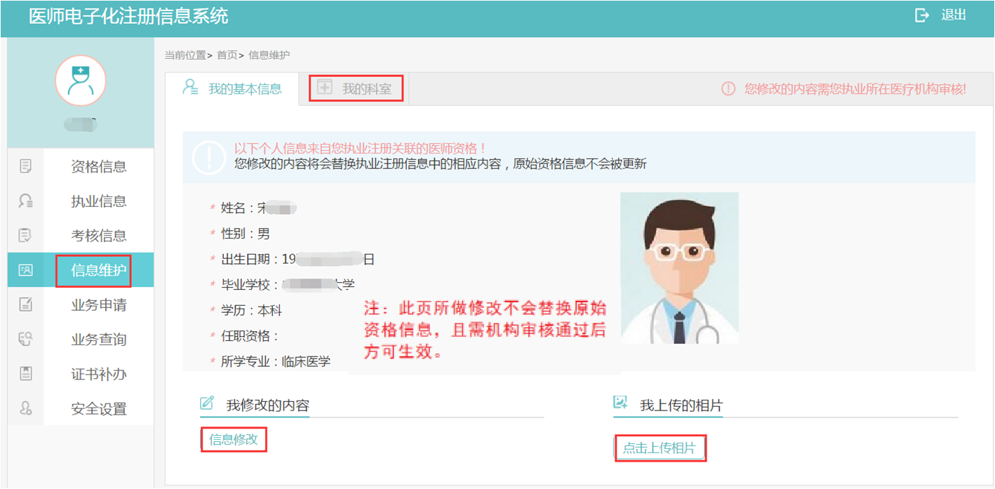 此功能模塊可修改個人信息,修改信息需執(zhí)業(yè)所在醫(yī)療機構審核通過后才能生效。