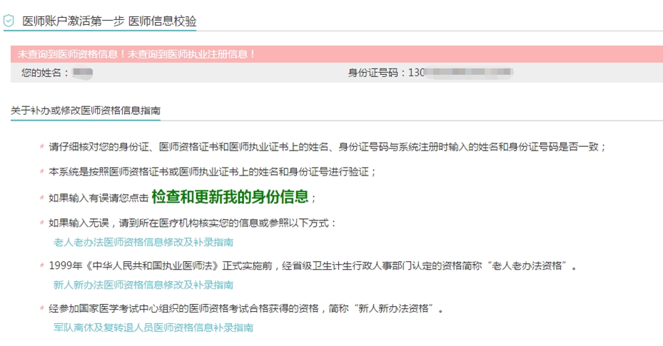 若未通過醫(yī)師資格校驗(yàn),則可能是注冊(cè)時(shí)填寫的姓名及身份證號(hào)碼有誤,請(qǐng)修改正確后繼續(xù)驗(yàn)證;如果確認(rèn)姓名及身份證號(hào)碼無誤,請(qǐng)?jiān)谙到y(tǒng)內(nèi)“資格補(bǔ)【改】指南”菜單中查看解決辦法。
