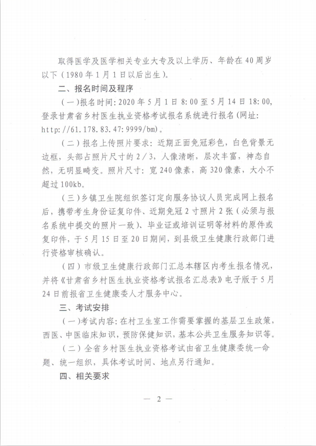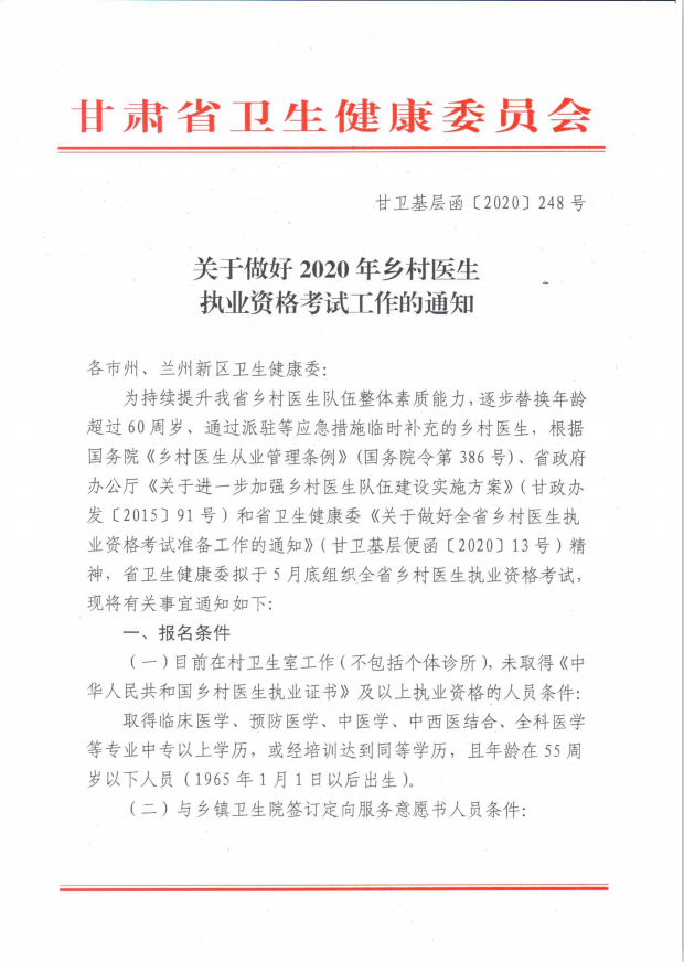 以上是“甘肅山丹縣2020年鄉(xiāng)村醫(yī)生執(zhí)業(yè)資格考試報(bào)名通知”,希望對廣大村醫(yī)有所幫助。