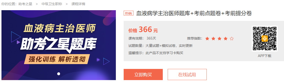 2020年血液病學(xué)主治醫(yī)師模擬試題庫哪里有?參加血液病學(xué)主治醫(yī)師考試的考生,都在為了如何更好備考而絞盡腦汁,想要多做題,查缺補(bǔ)漏?想多做好題,提升應(yīng)試技能?血液病學(xué)主治醫(yī)師考試好幫手,醫(yī)學(xué)教育網(wǎng)助考之星題庫軟件來襲!