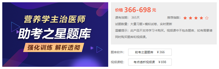 營養(yǎng)學(xué)主治醫(yī)師助考之星分為題庫(含題庫+金題卷+??季恚┖鸵曨l課程。均緊扣考試大綱、考試教材,符合考試題型與考試科目。復(fù)習(xí)輔導(dǎo)資料豐富,免費試用、試題庫大,輔導(dǎo)軟件收錄大量習(xí)題,并提供解題方法、答題技巧、考試要點精解?!澳M題版”是依據(jù)教材大綱推出的模擬題試卷產(chǎn)品,根據(jù)近年考試的考點編寫出題,進(jìn)行模擬真實考試仿真模擬題!