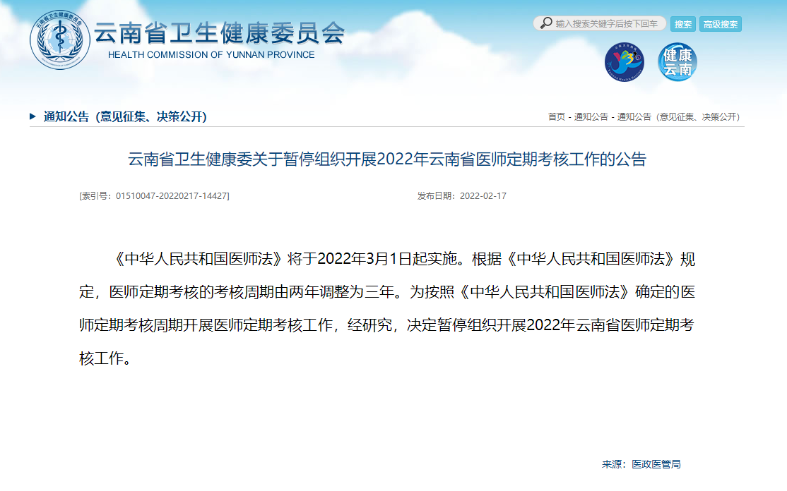 云南省衛(wèi)生健康委關(guān)于暫停組織開展2022年云南省醫(yī)師定期考核工作的公告