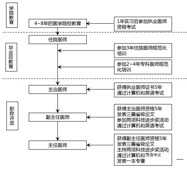 醫(yī)生除了接受這個(gè)定期的考核之外,還要每隔幾年按照:住院醫(yī)師、主治醫(yī)師、副主任醫(yī)師、主任醫(yī)師的序列根據(jù)個(gè)人學(xué)歷、工作年限、論文、科學(xué)進(jìn)步獎(jiǎng)活動(dòng)、專著、英語(yǔ)及計(jì)算機(jī)水平進(jìn)行職稱評(píng)定。此外,根據(jù)一定的教學(xué)序列:助教、講師、副教授、教授,醫(yī)生也要參加評(píng)定一定的教學(xué)職稱。