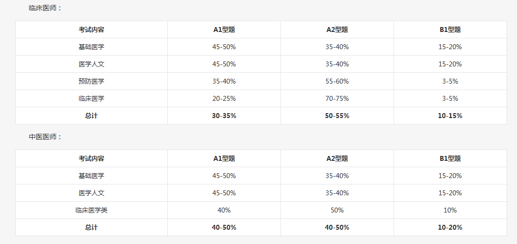理論考試總題量為400題,理論考試分為2個單元,每單元200題,每題1分。其中,基礎醫(yī)學占40-45%,醫(yī)學人文占5-10%,預防醫(yī)學占5-10%,臨床醫(yī)學占40-45%。