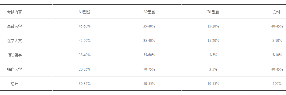 理論考試總題量為330題。其中,基礎(chǔ)醫(yī)學(xué)占40-45%,醫(yī)學(xué)人文占5-10%,預(yù)防醫(yī)學(xué)占5-10%,臨床醫(yī)學(xué)占40-45%。題型比例: