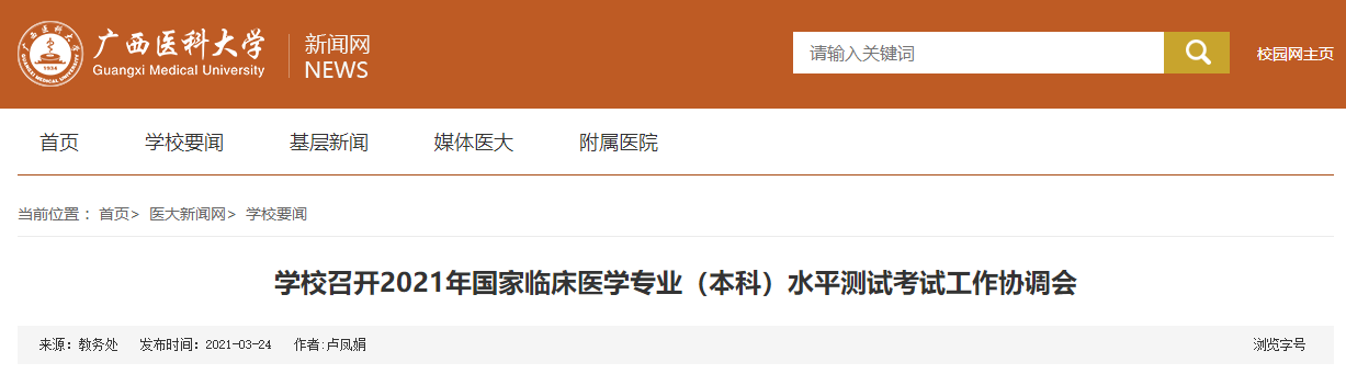 廣西醫(yī)科大學學校召開2021年國家臨床醫(yī)學專業(yè)(本科)水平測試考試工作協(xié)調會通知,相信參加廣西醫(yī)科大學2021年臨床醫(yī)學專業(yè)(本科)水平測試的考生都在關注,為方便大家了解,在此醫(yī)學教育網(wǎng)小編為大家整理如下內(nèi)容: