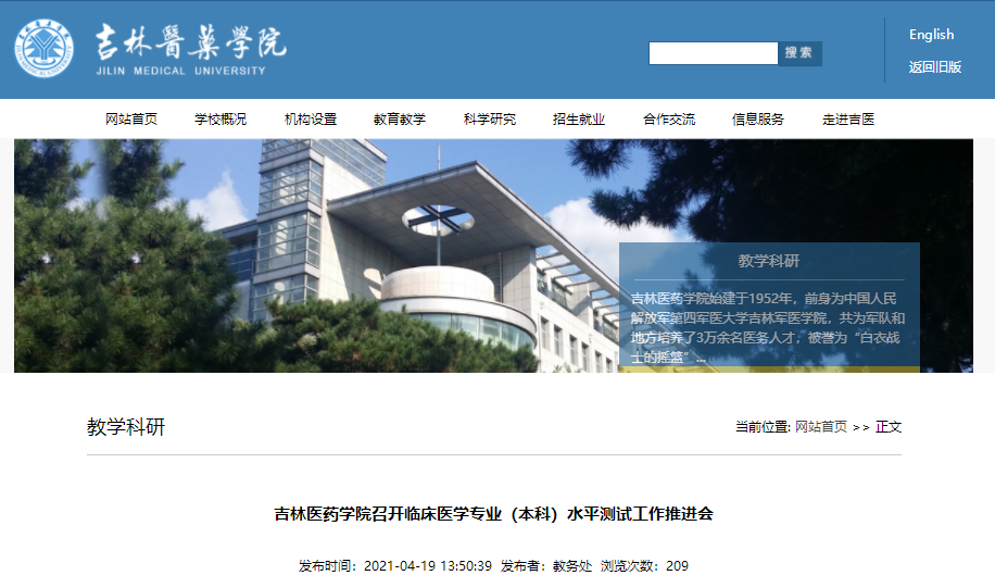 吉林醫(yī)藥學(xué)院發(fā)布召開臨床醫(yī)學(xué)專業(yè)(本科)水平測(cè)試工作推進(jìn)會(huì)通知,相信參加吉林醫(yī)藥學(xué)院臨床醫(yī)學(xué)院2021年臨床醫(yī)學(xué)專業(yè)(本科)水平測(cè)試的考生都在關(guān)注,為方便大家了解,在此醫(yī)學(xué)教育網(wǎng)小編為大家整理如下內(nèi)容: