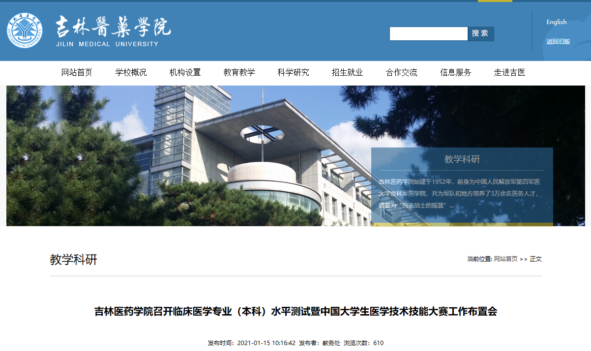 吉林醫(yī)藥學(xué)院召開臨床醫(yī)學(xué)專業(yè)(本科)水平測試暨中國大學(xué)生醫(yī)學(xué)技術(shù)技能大賽工作布置會,為幫助參加吉林醫(yī)藥學(xué)院2021年全國臨床醫(yī)學(xué)(本科)專業(yè)水平測試的考生了解,在此醫(yī)學(xué)教育網(wǎng)小編為大家整理如下內(nèi)容: