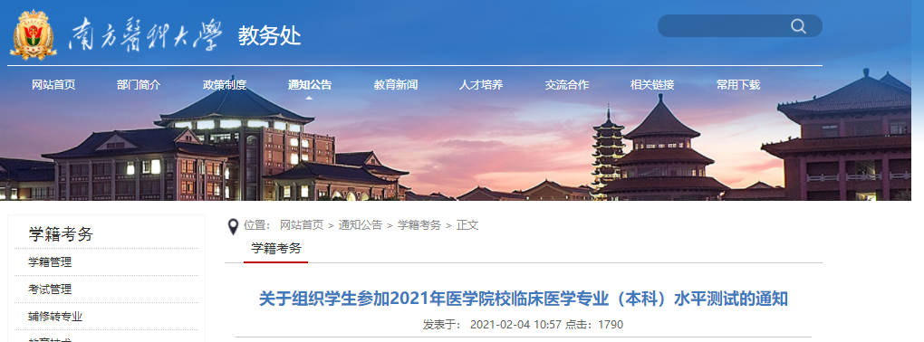 南方醫(yī)科大學(xué)發(fā)布關(guān)于組織學(xué)生參加2021年醫(yī)學(xué)院校臨床醫(yī)學(xué)專業(yè)(本科)水平測(cè)試的通知,為幫助參加南方醫(yī)科大學(xué)2021年全國臨床醫(yī)學(xué)(本科)專業(yè)水平測(cè)試的考生了解,在此醫(yī)學(xué)教育網(wǎng)小編為大家整理如下內(nèi)容: