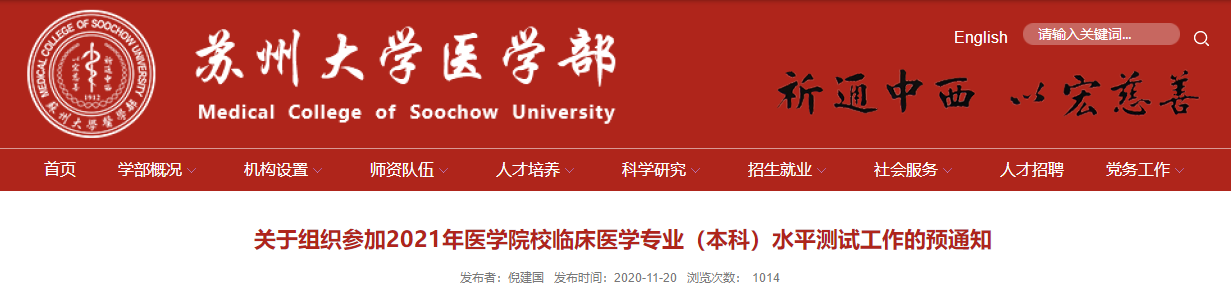 根據(jù)國家醫(yī)學(xué)考試中心、全國醫(yī)學(xué)教育發(fā)展中心《關(guān)于繼續(xù)開展醫(yī)學(xué)院校臨床醫(yī)學(xué)專業(yè)(本科)水平測試工作的通知》(國醫(yī)考發(fā)〔2020〕101號)精神(見附件1),經(jīng)研究決定,蘇州大學(xué)將組織臨床醫(yī)學(xué)類專業(yè)學(xué)生參加2021年的水平測試,現(xiàn)將有關(guān)事宜預(yù)通知如下: