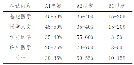理論考試總題量為330題(其中30題用于考試研究,不計(jì)入考生水平測試總成績)。其中,基礎(chǔ)醫(yī)學(xué)占40-45%,醫(yī)學(xué)人文占5-10%,預(yù)防醫(yī)學(xué)占5-10%,臨床醫(yī)學(xué)占40-45%。