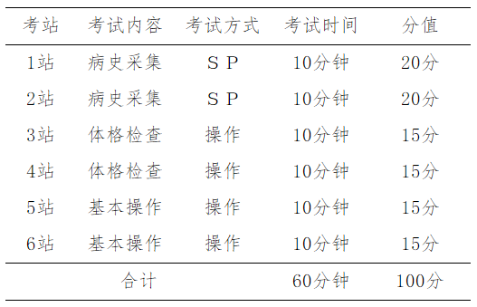 備注:溝通能力、人文關(guān)懷等醫(yī)學(xué)人文素養(yǎng)的考核融合到各站,分值約占15%。