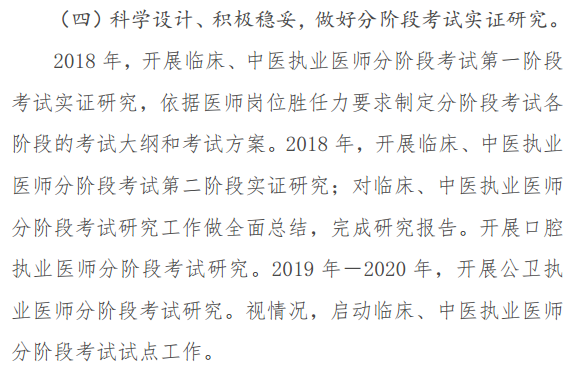 2018年,開展臨床、中醫(yī)執(zhí)業(yè)醫(yī)師分階段考試第一階段考試實證研究,依據(jù)醫(yī)師崗位勝任力要求制定分階段考試各階段的考試大綱和考試方案。2018 年,開展臨床、中醫(yī)執(zhí)業(yè)醫(yī)師分階段考試第二階段實證研究;對臨床、中醫(yī)執(zhí)業(yè)醫(yī)師分階段考試研究工作做全面總結,完成研究報告。開展口腔執(zhí)業(yè)醫(yī)師分階段考試研究。2019 年-2020 年,開展公衛(wèi)執(zhí)業(yè)醫(yī)師分階段考試研究。視情況,啟動臨床、中醫(yī)執(zhí)業(yè)醫(yī)師分階段考試試點工作。