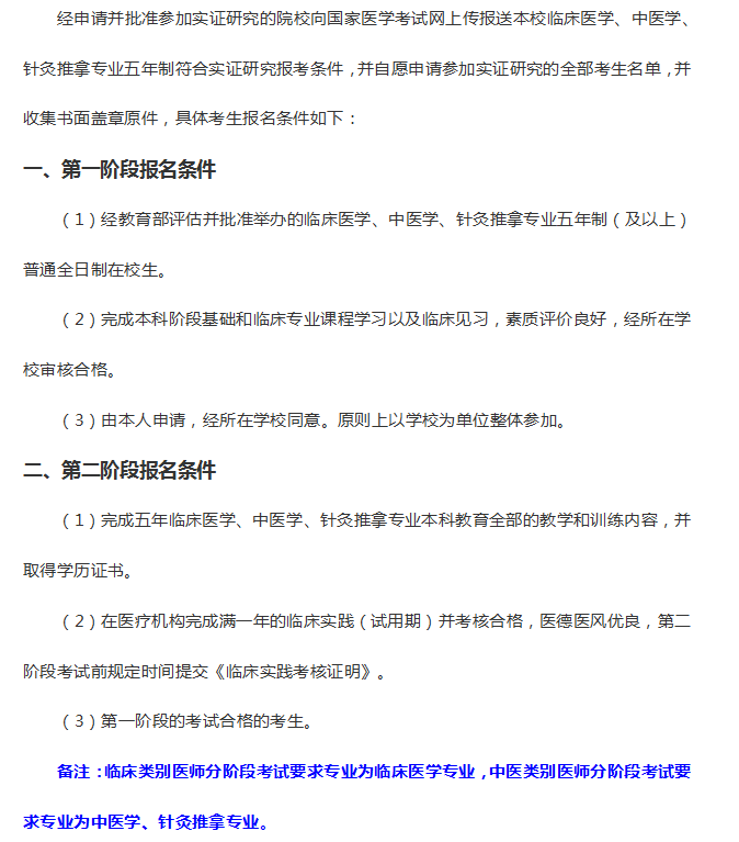 醫(yī)師分階段報名條件中要求:臨床類別醫(yī)師分階段考試要求專業(yè)為臨床醫(yī)學專業(yè),中醫(yī)類別醫(yī)師分階段考試要求專業(yè)為中醫(yī)學、針灸推拿專業(yè)。