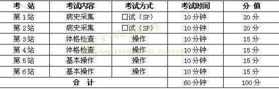 主要考查病史采集、體格檢查和基本操作技能,同時對溝通交流能力與人文關(guān)懷進(jìn)行評價。考站數(shù)量為6站,考試時間為60分鐘/考生,溝通能力、人文關(guān)懷等職業(yè)素質(zhì)的考核融合到各站案例,分值約占15%.考站設(shè)計詳見下表: