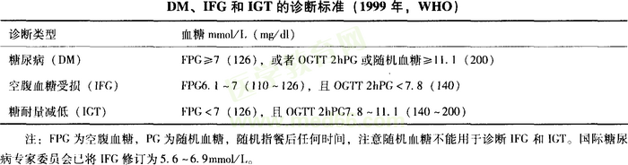 注:FPG為空腹血糖,PG為隨機血糖,隨機指餐后任何時間,注惹隨機血糖不能用于診斷IFG和IGT。國際糖尿病專家委員會已將IFG修訂為5.6~6.9mmol/L。
