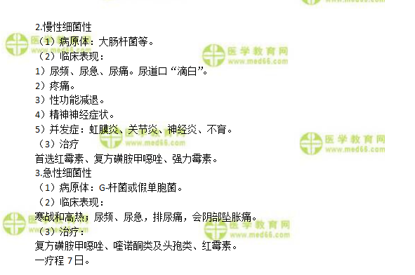 1.男,35歲。2月前突然出現(xiàn)尿頻、尿急及排尿痛,排尿時(shí)出現(xiàn)尿線間斷,并伴有寒戰(zhàn)和高熱醫(yī)學(xué)|教育網(wǎng)。直腸指檢前列腺腫脹、壓痛、局部溫度升高。尿沉渣可見白細(xì)胞。患者首先考慮
