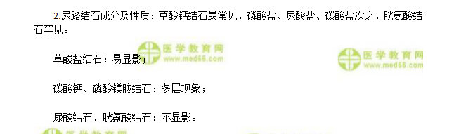 X線不能透過含鈣的物質(zhì),一般說來,大部分尿路結(jié)石都含有一定量的鈣(如草酸鈣、磷酸鈣、磷酸鎂銨結(jié)石等),都能在X線平片上顯示出來。對(duì)于一些不含鈣的結(jié)石(如胱氨酸、尿酸結(jié)石),X線平片上就不能顯示醫(yī)學(xué)|教育網(wǎng)。