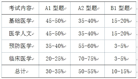 理論考試總題量為400題。其中,基礎(chǔ)醫(yī)學(xué)占40-45%,醫(yī)學(xué)人文占5-10%,預(yù)防醫(yī)學(xué)占5-10%,臨床醫(yī)學(xué)占40-45%.