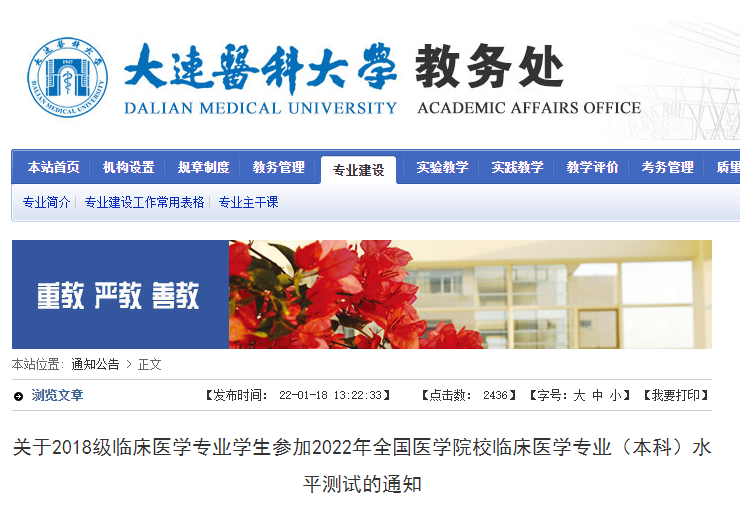 大連醫(yī)科大學(xué)關(guān)于2022年全國(guó)醫(yī)學(xué)院校臨床醫(yī)學(xué)專(zhuān)業(yè)(本科)水平測(cè)試的通知!具體通知內(nèi)容醫(yī)學(xué)教育網(wǎng)編輯整理分享如下:
