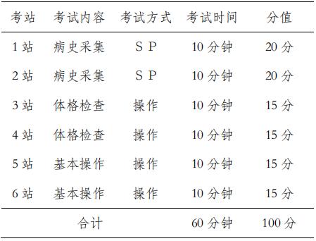 2、技能考試主要考察病史采集、體格檢查和基本操作技能,同時(shí)對(duì)溝通交流能力與人文關(guān)懷進(jìn)行評(píng)價(jià)??荚嚂r(shí)間長(zhǎng)度:分為6站,每站10分鐘,共1小時(shí)。溝通能力、人文關(guān)懷等醫(yī)學(xué)人文素養(yǎng)的考核融合到各站,分值約占15%??荚囋O(shè)計(jì)如下: