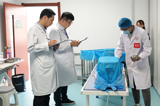 第一臨床醫(yī)學院各部門密切協(xié)同,克服時間緊,任務重等困難,從臨床一線抽調(diào)專業(yè)技術(shù)人員組織、培訓、選拔考官36人,招募培訓學生志愿者101人,楊永秀教授在考試前多次帶領教學管理人員勘察場地,指導工作,以嚴謹?shù)膽B(tài)度確??荚嚋蕚涔ぷ黜樌瓿?。