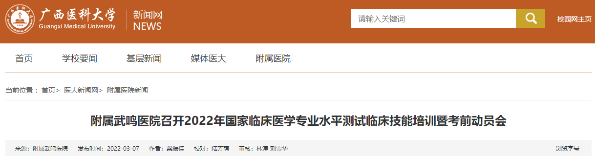 為進(jìn)一步做好廣西醫(yī)科大學(xué)2018級(jí)臨床醫(yī)學(xué)生2022年國(guó)家臨床醫(yī)學(xué)(本科)水平測(cè)試準(zhǔn)備工作,按照學(xué)校統(tǒng)一部署,附屬武鳴醫(yī)院于3月3日在醫(yī)院5號(hào)樓7樓多媒體教室召開(kāi)2022年國(guó)家臨床醫(yī)學(xué)專業(yè)水平測(cè)試臨床技能培訓(xùn)暨考前動(dòng)員會(huì)。教務(wù)科、培訓(xùn)教師團(tuán)隊(duì)、廣西醫(yī)科大學(xué)2018級(jí)臨床醫(yī)學(xué)專業(yè)(農(nóng)村訂單)學(xué)生等人員參會(huì)。