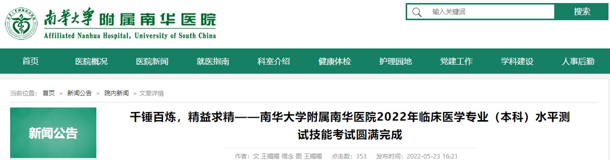 關(guān)于南華大學(xué)附屬南華醫(yī)院2022年臨床醫(yī)學(xué)專業(yè)(本科)水平測試技能考試圓滿完成的信息內(nèi)容,醫(yī)學(xué)教育網(wǎng)編輯為您整理以下相關(guān)信息,請考生及時查看: