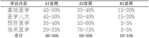 理論考試總題量為 330 題(其中 30 題用于考試研究,不計入考生水平測試總成績)?;A(chǔ)醫(yī)學(xué)占 40-45%,醫(yī)學(xué)人文占5-10%,預(yù)防醫(yī)學(xué)占 5-10%,臨床醫(yī)學(xué)占 40-45%。